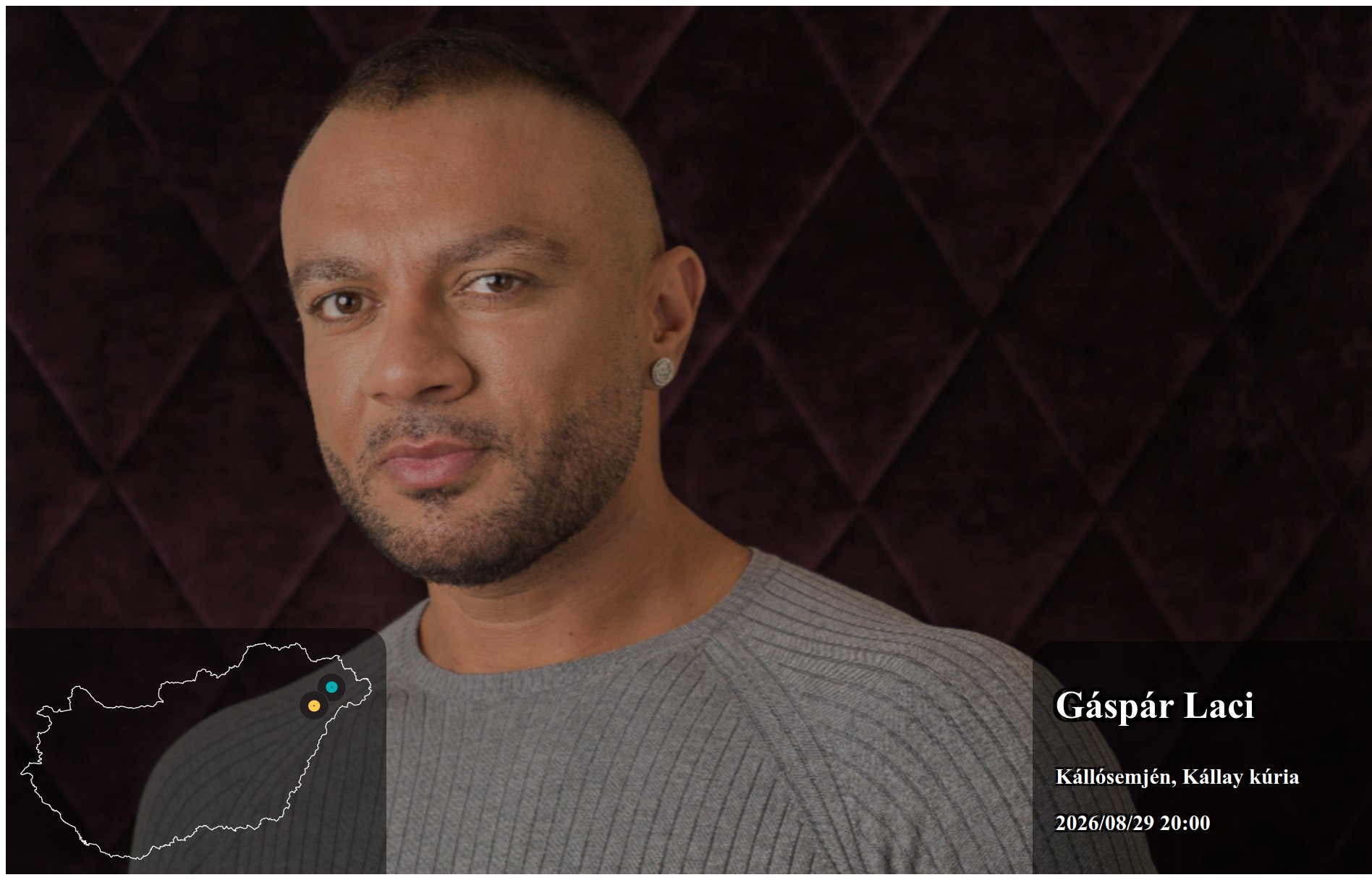 Az itt megjelenő eseményeket a produkció, vagy annak képviselője rögzítette. Az oldalon lévő információk valódiságáért a Koncertbooking.com ennek kapcsán felelősséget nem tud vállalni. Indulás előtt ellenőrizze az adott település vagy eseményhelyszín oldalán is a rendezvény paramétereit.