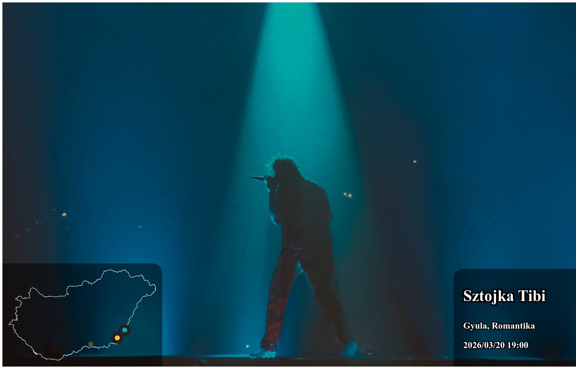 Az itt megjelenő eseményeket a produkció, vagy annak képviselője rögzítette. Az oldalon lévő információk valódiságáért a Koncertbooking.com ennek kapcsán felelősséget nem tud vállalni. Indulás előtt ellenőrizze az adott település vagy eseményhelyszín oldalán is a rendezvény paramétereit.